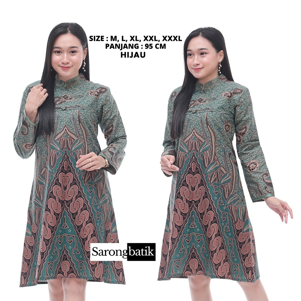 Atasan Tunik Batik Wanita Kencono TB0012SB dengan varian warna hijau, merah dan biru harga murah menggunakan bahan katun prima. Tunik/Dress batik lengan panjang 51 cm - 52 cm cocok untuk digunakan saat santai ataupun untuk baju kerja di kantor